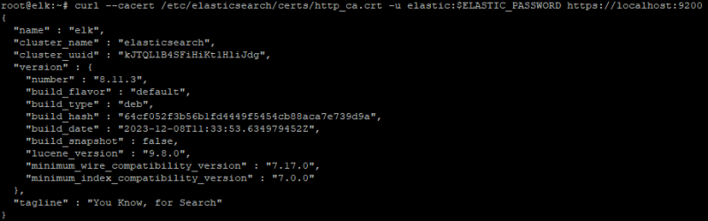 export ELASTIC_PASSWORD="your_password" curl --cacert /etc/elasticsearch/certs/http_ca.crt -u elastic:$ELASTIC_PASSWORD https://localhost:9200