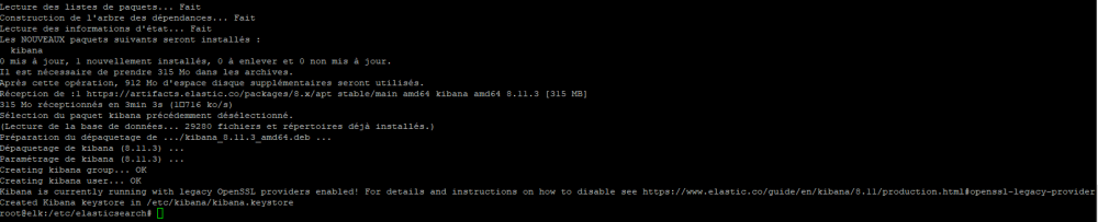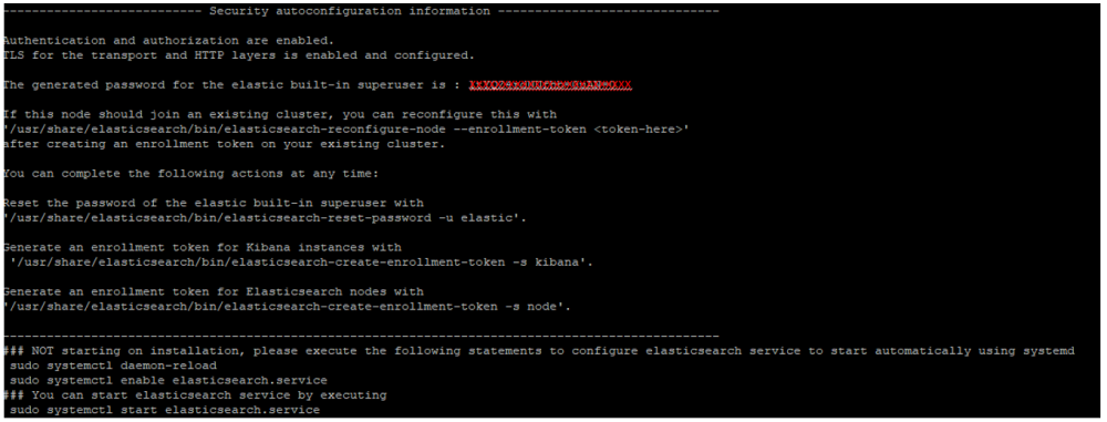 - L'authentification et les droits sont activées et un mot de passe est généré pour le super utilisateur elastic par défaut.