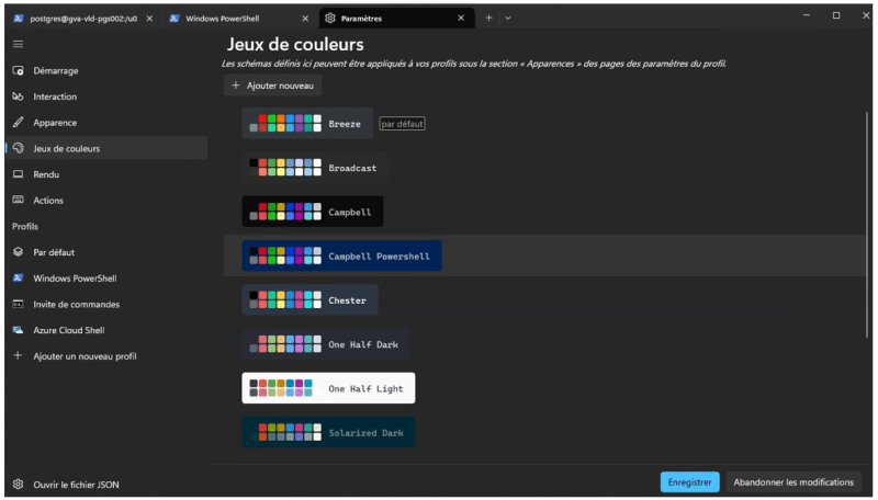 - ouvrir le fichier settings.json et ajouter en fin de fichier, dans la balise schemes, ajouter les thème désirés, en séparant chaque thèmes par une virgule